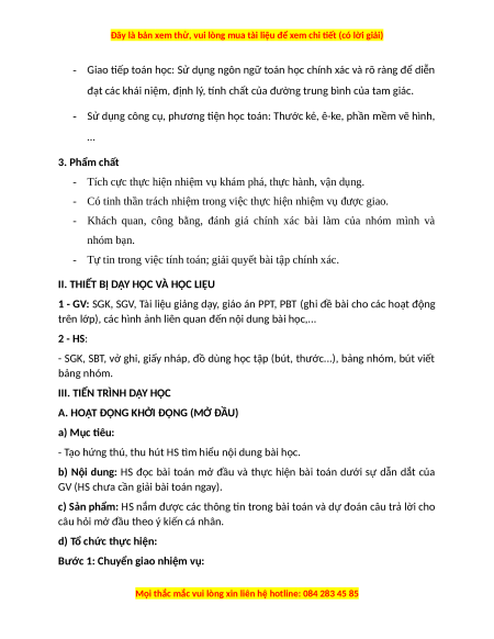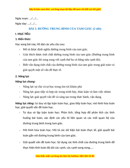 BÀI 3. ĐƯỜNG TRUNG BÌNH CỦA TAM GIÁC (2 tiết) I. MỤC TIÊU: 1. Kiến thức: