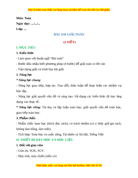 Ngày dạy: .../.../... L p: ớ ... BÀI: EM GIẢI TOÁN (2 TIẾT) I. M C Ụ TIÊU 1. Ki n t ế h c ứ - Làm quen v i ớ thu t ậ ng “B ữ ài toán” - Bư c ớ đ u nh ầ n bi ậ t ế phư ng ơ pháp (4 bư c) ớ để gi i ả toán có l i ờ văn - V n ậ d ng gi ụ i ả và trình bày bài gi i ả 2. Năng l c ự