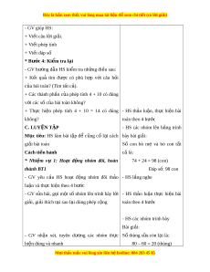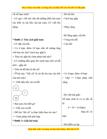 ả là cái đã cho hay câu h i ỏ + Có 4 b n, t ạ hêm 10 b n ạ c a ủ bài toán? + G p ộ => Ch n ọ phép tính => Vi t ế d u h ấ i ỏ vào s đ ơ : ồ c ng ộ - HS vi t ế bài gi i ả : Số b n ạ ch i ơ lò cò có t t ấ cả + Bài toán cho bi t ế gì? là: => Vi t ế vào s đ ơ ồ 4 + 10 = 14 (b n) ạ + Đ t ể ìm “t t ấ c ” ả ta th c hi ự n t ệ hao tác nào? Đáp s : ố 14 => Ch n ọ phép tính phù h p ợ b n ạ