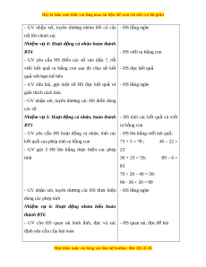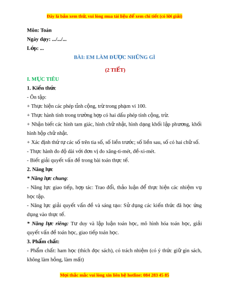 Ngày dạy: .../.../... L p: ớ ... BÀI: EM LÀM ĐƯ C Ợ NH N Ữ G GÌ (2 TIẾT) I. M C Ụ TIÊU 1. Ki n t ế h c ứ - Ôn t p: ậ + Th c ự hi n các ệ phép t nh c ỉ ng, t ộ r t ừ rong ph m ạ vi 100. + Th c