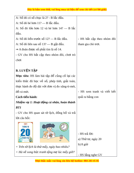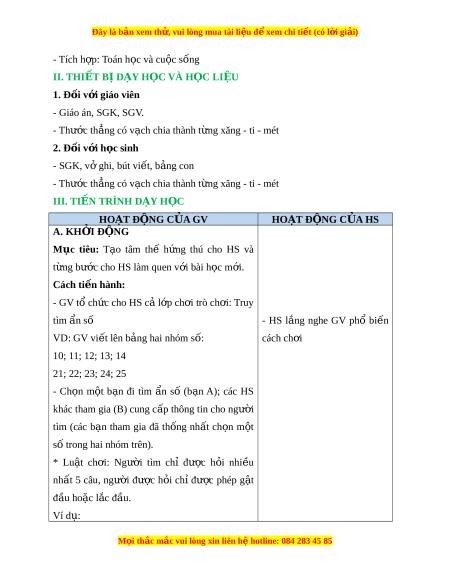 Đây là bản xem th , vu ử i lòng mua tài li u ệ đ xe ể m chi ti t (c ế ó l i ờ gi i ả ) - Tích h p: ợ Toán h c và cu ọ c ộ s ng ố II. THIẾT B D Ị ẠY H C Ọ VÀ H C Ọ LI U Ệ 1. Đ i ố v i ớ giáo viên - Giáo án, SGK, SGV. - Thư c t ớ h ng ẳ có v ch ạ chia thành t ng xăng - ừ ti - mét 2. Đ i ố v i ớ h c s ọ inh - SGK, v ghi ở , bút vi t ế , b ng con ả - Thư c t ớ h ng ẳ có v ch ạ chia thành t ng xăng - ừ ti - mét III. TI N Ế TRÌNH D Y Ạ H C Ọ HOẠT Đ N Ộ G C A Ủ GV HOẠT Đ N Ộ G C A Ủ HS A. KH I Ở Đ N Ộ G Mục tiêu: T o ạ tâm thế h ng ứ thú cho HS và t ng b ừ ư c ớ cho HS làm quen v i ớ bài h c ọ m i ớ . Cách ti n hà ế nh: - GV tổ ch c ứ cho HS c l ả p ớ ch i ơ trò ch i ơ : Truy tìm n s ẩ ố - HS l ng ắ nghe GV phổ bi n ế VD: GV vi t ế lên b ng ả hai nhóm s : ố cách ch i ơ 10; 11; 12; 13; 14 21; 22; 23; 24; 25 - Ch n ọ m t ộ b n ạ đi tìm n ẩ số (b n ạ A); các HS khác tham gia (B) cung c p t ấ hông tin cho ngư i ờ tìm (các b n ạ tham gia đã th ng ố nh t ấ ch n ọ m t ộ số trong hai nhóm trên). * Lu t ậ ch i ơ : Ngư i ờ tìm chỉ đư c ợ h i ỏ nhi u ề nhất 5 câu, ngư i ờ đư c ợ h i ỏ chỉ đư c ợ phép g t ậ đầu ho c ặ l c đ ắ u. ầ Ví d : ụ M i