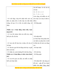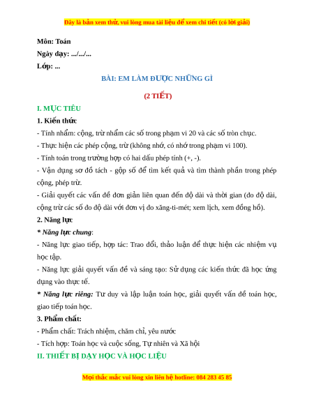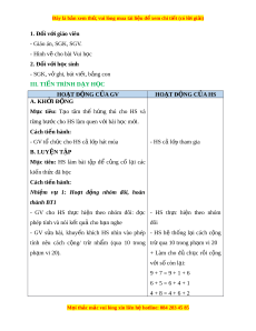 Ngày dạy: .../.../... L p: ớ ... BÀI: EM LÀM ĐƯ C Ợ NH N Ữ G GÌ (2 TIẾT) I. M C Ụ TIÊU 1. Ki n t ế h c ứ - Tính nh m ẩ : c ng, ộ tr nh ừ m ẩ các s t ố rong ph m ạ vi 20 và các s t ố ròn ch c. ụ - Th c hi ự n các phép ệ c ng, t ộ r ( ừ không nh , ớ có nh t ớ rong ph m ạ vi 100). - Tính toán trong trư ng h ờ p ợ có hai d u phép t ấ ính (+, -). - V n ậ d ng ụ sơ đồ tách - g p ộ số để tìm k t ế quả và tìm thành ph n ầ trong phép c ng, ộ phép tr . ừ - Gi i ả quy t ế các v n ấ đề đ n ơ gi n ả liên quan đ n ế độ dài và th i ờ gian (đo độ dài, c ng ộ tr các ừ số đo đ dài ộ v i ớ đ n v ơ đo xăng ị -ti-mét; xem l ch, ị xem đ ng h ồ ) ồ . 2. Năng l c ự