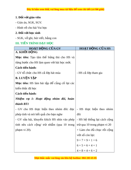 Đây là bản xem th , vu ử i lòng mua tài li u ệ đ xe ể m chi ti t (c ế ó l i ờ gi i ả ) 1. Đ i ố v i ớ giáo viên - Giáo án, SGK, SGV. - Hình v cho bài ẽ Vui h c ọ 2. Đ i ố v i ớ h c s ọ inh - SGK, v ghi ở , bút vi t ế , b ng con ả III. TI N Ế TRÌNH D Y Ạ H C Ọ HOẠT Đ N Ộ G C A Ủ GV HOẠT Đ N Ộ G C A Ủ HS A. KH I Ở Đ N Ộ G Mục tiêu: T o ạ tâm thế h ng ứ thú cho HS và t ng b ừ ư c ớ cho HS làm quen v i ớ bài h c ọ m i ớ . Cách ti n hà ế nh: - GV tổ ch c ứ cho HS c l ả p ớ hát múa - HS cả l p t ớ ham gia B. LUY N Ệ T P Ậ