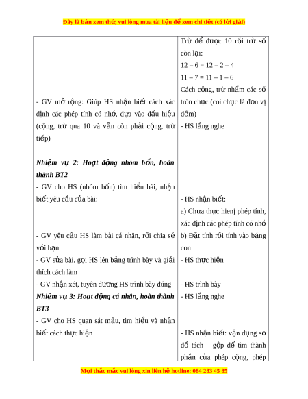 Đây là bản xem th , vu ử i lòng mua tài li u ệ đ xe ể m chi ti t (c ế ó l i ờ gi i ả ) Trừ để đư c ợ 10 r i ồ trừ số còn l i ạ : 12 – 6 = 12 – 2 – 4 11 – 7 = 11 – 1 – 6 Cách c ng, ộ trừ nh m ẩ các số - GV mở r ng: ộ Giúp HS nh n ậ bi t ế cách xác tròn ch c ụ (coi ch c ụ là đ n ơ vị