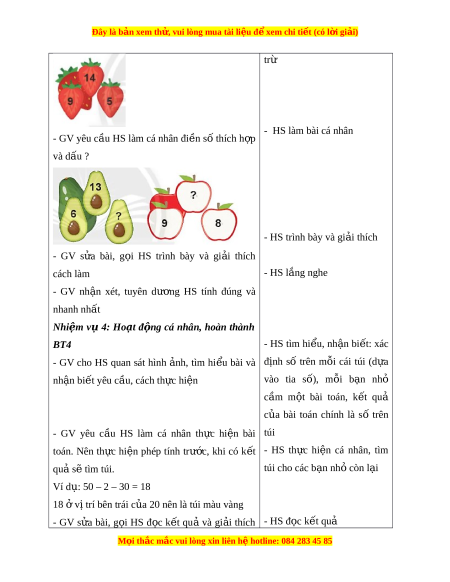 Đây là bản xem th , vu ử i lòng mua tài li u ệ đ xe ể m chi ti t (c ế ó l i ờ gi i ả ) trừ - HS làm bài cá nhân - GV yêu c u ầ HS làm cá nhân đi n ề s t ố hích h p ợ và dấu ? - HS trình bày và gi i ả thích - GV s a ử bài, g i ọ HS trình bày và gi i ả thích cách làm - HS l ng ắ nghe - GV nh n ậ xét, tuyên dư ng ơ HS tính đúng và nhanh nhất Nhi m ệ vụ 4: Ho t ạ đ ng