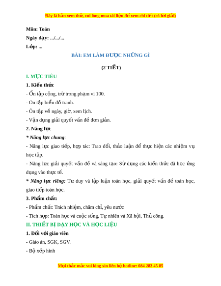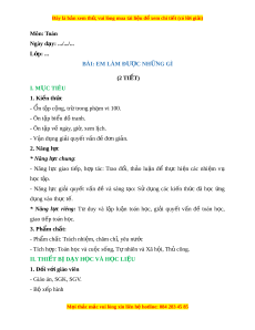 Ngày dạy: .../.../... L p: ớ ... BÀI: EM LÀM ĐƯ C Ợ NH N Ữ G GÌ (2 TIẾT) I. M C Ụ TIÊU 1. Ki n t ế h c ứ - Ổn t p c ậ ng, t ộ r t ừ rong ph m ạ vi 100. - Ôn t p bi ậ u đ ể ồ tranh. - Ôn t p v ậ ề ngày, gi , xem ờ l ch. ị - V n ậ d ng gi ụ i ả quy t ế v n đ ấ đ ề n ơ gi n. ả 2. Năng l c ự