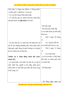 ch HS giải thích cách làm. - HS th o l ả u n ậ - HS trình bày trư c l ớ p ớ a) Xe kh i ở hành t i ạ b n ế Mỹ Đình vào Thứ 5 ngày 30 tháng 12 - Sau khi s a ử bài, GV giáo d c ụ HS phép l ch ị sự Lúc 10 gi , bu ờ ổi tối khi đi trên nh ng ữ phư ng ơ ti n ệ công c ng: ộ đ n ế b) Xe đ n b ế n S ế n ơ La vào: đúng gi , ờ ng i ồ đúng số gh , ế không nói chuy n ệ Thứ 6 ngày 31 tháng