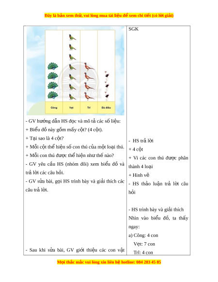 ọ và mô tả các số liệu: + Bi u ể đ này ồ g m ồ m y c ấ t ộ ? (4 c t ộ ). + T i ạ sao là 4 c t ộ ? - HS trả l i ờ + Mỗi c t ộ th hi ể n s ệ ố con thú c a m ủ t ộ lo i ạ thú. + 4 c t ộ + Mỗi con thú đư c ợ th hi ể n nh ệ t ư h nào? ế + Vi các con thú đư c ợ phân - GV yêu c u ầ HS (nhóm đôi) xem bi u ể đồ và thành 4 lo i ạ tr l ả i ờ các câu h i ỏ . + Hinh vẽ - GV s a ử bài, g i ọ HS trình bày và gi i ả thích các - HS th o ả lu n ậ trả l i ờ câu câu trả l i ờ . h i ỏ - HS trình bày và gi i ả thích Nhìn vào bi u ể đ , ồ ta th y ấ ngay: a) Công: 4 con Vẹt: 7 con - Sau khi s a ử bài, GV gi i ớ thi u ệ các con v t ậ Trĩ: 4 con M i
