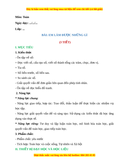 Ngày dạy: .../.../... L p: ớ ... BÀI: EM LÀM ĐƯ C Ợ NH N Ữ G GÌ (3 TIẾT) I. M C Ụ TIÊU 1. Ki n t ế h c ứ - Ôn t p v ậ ề số: + Đ c ọ vi t ế s , c ố u t ấ o s ạ , vi ố t ế số thành t ng các ổ trăm, ch c, ụ đ n v ơ . ị + Tia số. + Số li n t ề rư c, ớ s l ố i n s ề au. + So sánh các s . ố - Gi i ả quy t ế v n đ ấ đ ề n ơ gi n ả liên quan đ n phép t ế ính nhân. - Ôn t p v ậ ề đ c bi ọ u đ ể ồ tranh. 2. Năng l c ự
