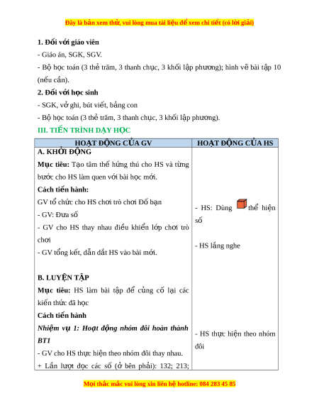 ọ toán (3 thẻ trăm, 3 thanh ch c, ụ 3 kh i ố l p ậ phư ng) ơ ; hình v ẽ bài t p ậ 10 (n u c ế ần). 2. Đ i ố v i ớ h c s ọ inh - SGK, v ghi ở , bút vi t ế , b ng con ả - Bộ h c t ọ oán (3 th t ẻ răm, 3 thanh ch c, ụ 3 kh i ố l p ậ phư ng) ơ . III. TI N Ế TRÌNH D Y Ạ H C Ọ HOẠT Đ N Ộ G C A Ủ GV HOẠT Đ N Ộ G C A Ủ HS A. KH I Ở Đ N Ộ G Mục tiêu: T o ạ tâm thế h ng ứ thú cho HS và t ng ừ bư c ớ cho HS làm quen v i ớ bài h c ọ m i ớ . Cách ti n hà ế nh: GV tổ ch c cho H ứ S ch i ơ trò ch i ơ Đ b ố n ạ - HS: Dùng thể hi n ệ - GV: Đ a s ư ố số - GV cho HS thay nhau đi u ề khi n ể l p ớ ch i ơ trò ch i ơ - HS l ng ắ nghe - GV tổng k t ế , d n d ẫ t ắ HS vào bài m i ớ . B. LUY N Ệ T P Ậ