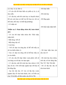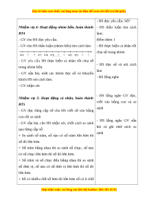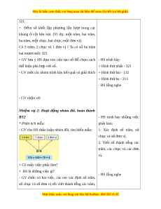 ơ vị Ta có số ba trăm hai mư i ơ mốt: 321. • GV l u ư ý HS d a ự vào c u ấ t o ạ số để ch n ọ cách - HS trình bày: th hi ể n phù h ệ p v ợ i ớ số. + Hình th nh ứ t ấ - 321 - GV m i ờ các nhóm trình bày k t ế qu và gi ả i ả thích + Hình th hai ứ - 132 + Hình th ba - ứ 213 - HS l ng ắ nghe - GV nh n xét ậ Nhi m ệ vụ 2: Ho t ạ đ ng