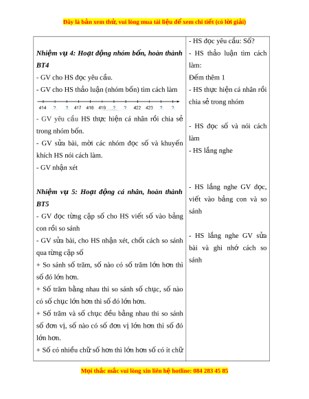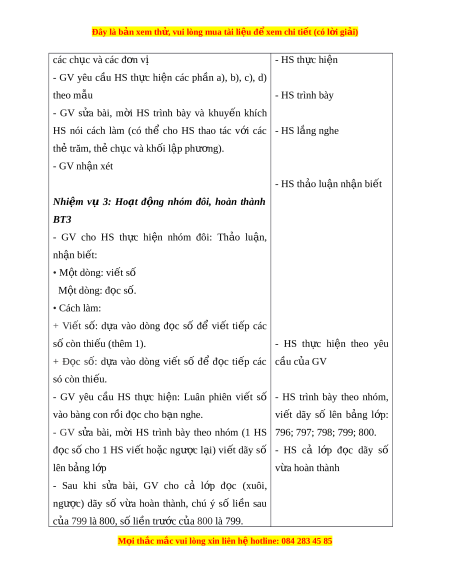 ộ nhóm đôi, hoàn thành BT3 - GV cho HS th c ự hi n ệ nhóm đôi: Th o ả lu n, ậ nh n ậ bi t ế : • M t ộ dòng: vi t ế số M t ộ dòng: đ c ọ số. • Cách làm: + Vi t ế số: d a ự vào dòng đ c ọ số để vi t ế ti p ế các số còn thi u ế (thêm 1). - HS th c ự hi n ệ theo yêu + Đ c ọ s : ố d a ự vào dòng vi t ế số để đ c ọ ti p ế các cầu c a G ủ V só còn thi u. ế - GV yêu c u ầ HS th c ự hi n ệ : Luân phiên vi t