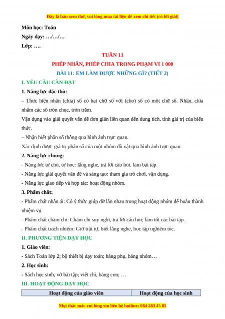 - Sách Toán lớp 2; bộ thiết bị dạy toán; bảng phụ, bảng nhóm… 2. Học sinh:
