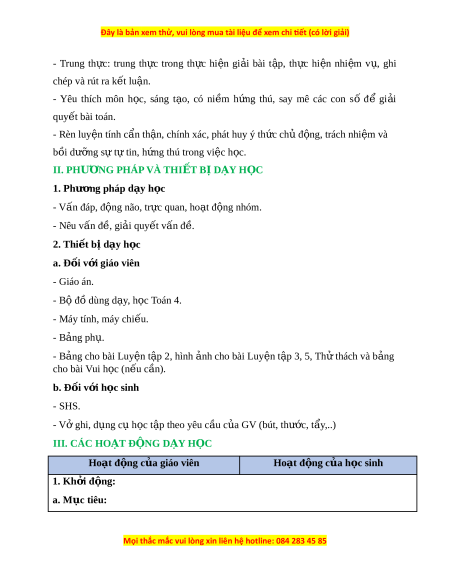 ứ thú, say mê các con số để gi i ả quy t ế bài toán. - Rèn luy n t ệ ính c n t ẩ h n, chí ậ nh xác, phát huy ý th c ch ứ đ ủ ng, ộ trách nhi m ệ và bồi dư ng s ỡ ự t t ự in, h ng t ứ hú trong vi c h ệ c. ọ II. PHƯ N Ơ G PHÁP VÀ THI T Ế B D Ị Y Ạ H C Ọ 1. Phư ng ơ pháp d y h ạ c ọ - Vấn đáp, đ ng ộ não, tr c ự quan, ho t ạ đ ng nhóm ộ . - Nêu vấn đ , gi ề i ả quy t ế v n đ ấ . ề 2. Thi t ế b d ị y h ạ c ọ a. Đ i ố v i ớ giáo viên - Giáo án. - Bộ đồ dùng d y ạ , h c ọ Toán 4. - Máy tính, máy chi u. ế - B ng ả ph . ụ - B ng ả cho bài Luy n t ệ p ậ 2, hình nh cho bài ả Luy n t ệ p 3, 5, ậ Th t ử hách và b ng ả cho bài Vui h c ( ọ n u c ế n ầ ). b. Đ i ố v i ớ h c s ọ inh - SHS. - Vở ghi, d ng c ụ h ụ c ọ t p t ậ heo yêu c u c ầ a ủ GV (bút, thư c, t ớ ẩy,..) III. CÁC HO T Ạ Đ N Ộ G D Y Ạ H C Ọ Hoạt đ ng c ộ a gi ủ áo viên Hoạt đ ng c ộ a h ủ c s ọ inh 1. Kh i ở đ ng: ộ a. Mục tiêu: