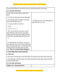 hú, kích thích sự tò mò c a H ủ S trư c khi ớ vào bài h c. ọ b. Cách th c t ứ i n hành: ế GV tổ ch c ứ cho HS ch i ơ trò ch i ơ "Đ ố b n" ạ : + GV đ c ọ r i ồ vi t ế phép tính lên b ng ả l p. ớ + HS vi t ế k t ế qu vào b ả ng ả con r i ồ gi ơ - Cả l p quan s ớ át, chú ý l ng nghe và ắ lên theo hi u l ệ nh c ệ a ủ GV. th c ự hi n t ệ heo yêu c u. ầ + GV g i ọ vài HS nói cách làm. - Ví d : ụ + GV: 8 + 9 + 2 + 1