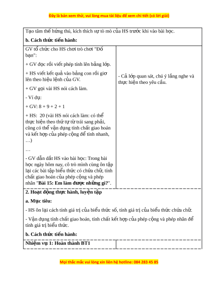 nhân "Bài 15: Em làm đư c ợ nh ng gì ữ ?". 2. Hoạt đ ng t ộ h c hành, l ự uy n t ệ p ậ a. Mục tiêu: - HS ôn l i ạ cách tính giá tr c ị a ủ bi u t ể h c s ứ , t ố ính giá tr c ị a ủ bi u t ể h c ch ứ a ứ ch . ữ - V n ậ d ng t ụ ính ch t ấ giao hoán, tính ch t ấ k t ế h p c ợ a phép ủ c ng và phép nhân ộ đ ể tính giá tr bi ị u t ể h c. ứ b. Cách th c t ứ i n hành: ế Nhi m ệ v 1: ụ Hoàn thành BT1