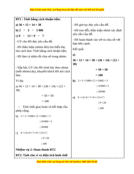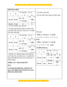 I. YÊU CẦU CẦN ĐẠT 1. Năng l c đ ự c t ặ hù - HS ôn l i ạ cách tính giá tr c ị a bi ủ u t ể h c ứ s , t ố ính giá tr c ị a bi ủ u ể th c ứ ch a ứ ch , ữ chu vi và di n t ệ ích hình ch nh ữ t ậ ; th c hi ự n đ ệ ư c ợ phép nhân m t ộ s v ố i ớ m t ộ hiệu qua các trư ng ờ h p c ợ t ụ h . ể - V n ậ d ng ụ tính ch t ấ giao hoán, tính ch t ấ k t ế h p ợ c a ủ phép c ng, ộ phép nhân để tính giá tr c ị a ủ bi u t ể h c. ( ứ Năng l c t ự duy và ư l p l ậ u n t ậ oán h c) ọ . - V n ậ d ng ụ các tính ch t ấ c a