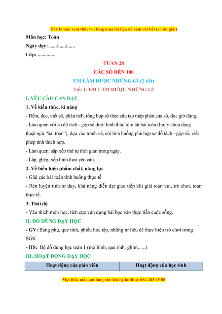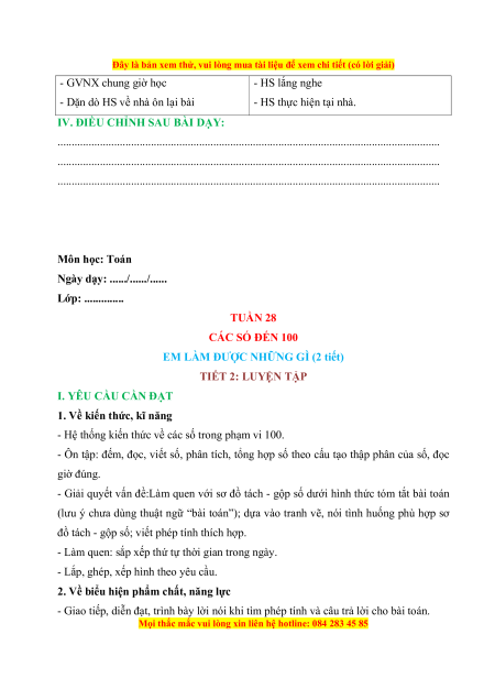 Ngày dạy: ....../....../...... Lớp: .............. TUẦN 28 CÁC SỐ ĐẾN 100