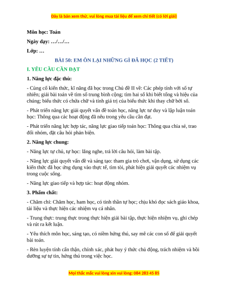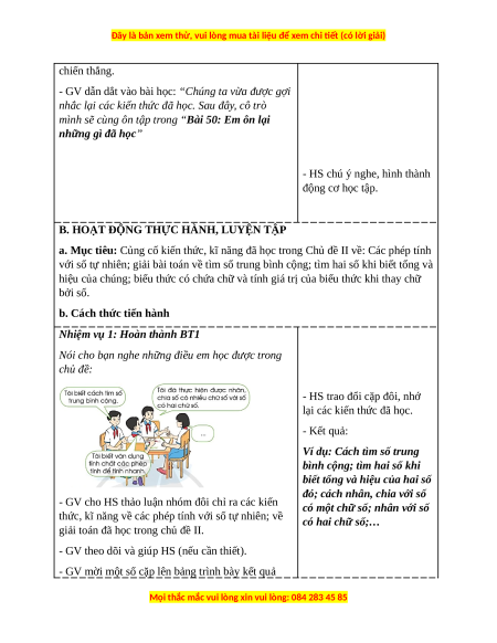 - Củng cố kiến thức, kĩ năng đã học trong Chủ đề II về: Các phép tính với số tự