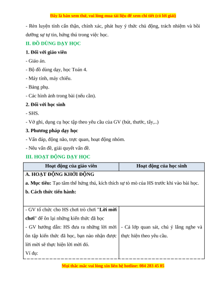 - Bộ đồ dùng dạy, học Toán 4. - Máy tính, máy chiếu. - Bảng phụ.