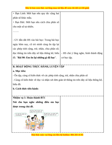 - Thực hành cộng, trừ, nhân, chia phân số, tìm phân số của một số và giải quyết vấn đề trong thực tiễn.