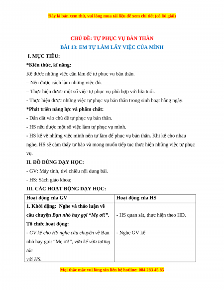 BÀI 13: EM TỰ LÀM LẤY VIỆC CỦA MÌNH I. MỤC TIÊU: