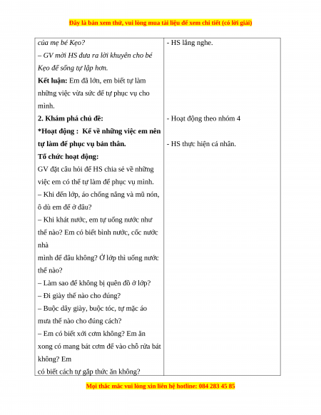 nghe, HS sẽ cảm thấy tự hào và mong muốn tiếp tục thực hiện những việc tự phục vụ.