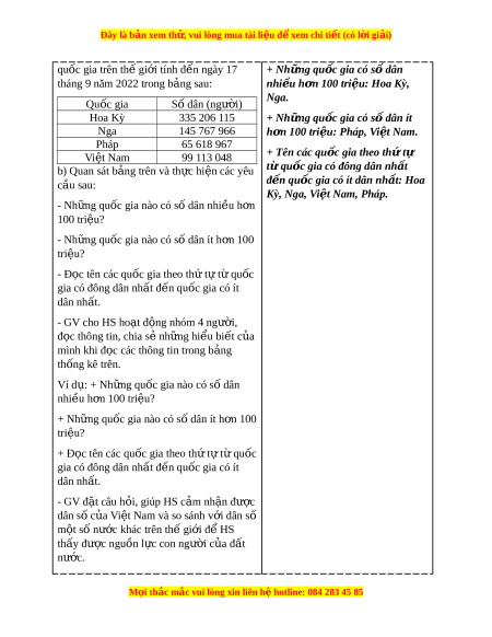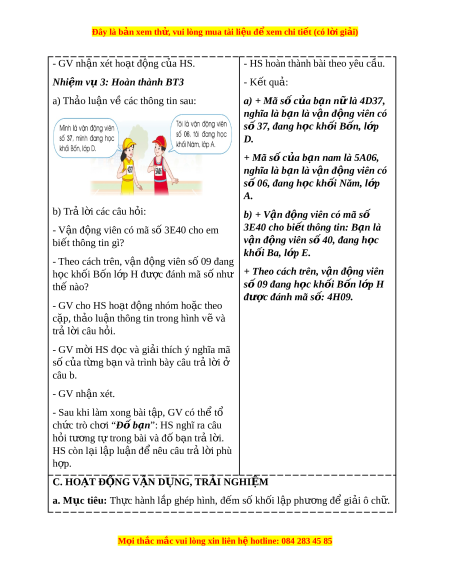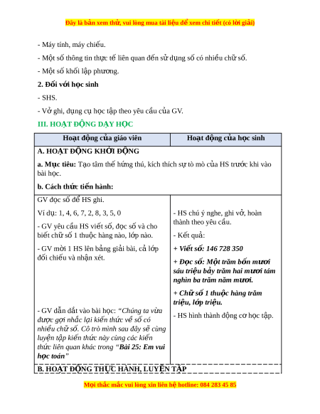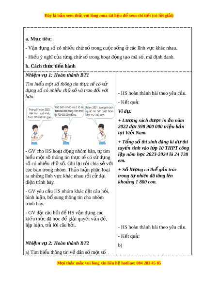 Đây là bản xem th , vu ử i lòng mua tài li u ệ đ xe ể m chi ti t (c ế ó l i ờ gi i ả ) a. Mục tiêu: - V n d ậ ng ụ số có nhi u ch ề s ữ ố trong cu c ộ s ng ố các ở lĩnh v c ự khác nhau. - Hi u ể ý nghĩ c a ủ t ng ch ừ s ữ ố trong ho t ạ đ ng ộ t o m ạ ã s , m ố ã đ nh danh. ị b. Cách th c t ứ i n hành ế Nhi m ệ v 1