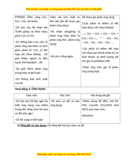 -Tính chất hoá học của C2H4: Phản ứng cộng với dd Br2, phản ứng trùng hợp tạo PE, phản ứng cháy.