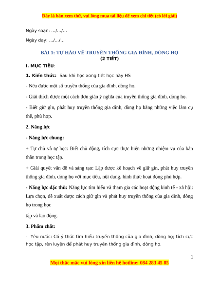 BÀI 1: TỰ HÀO VỀ TRUYỀN THỐNG GIA ĐÌNH, DÒNG HỌ (2 TIẾT) I. MỤC TIÊU: