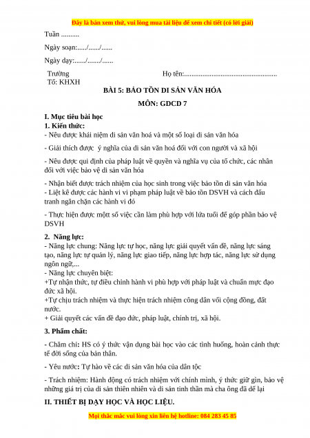 BÀI 5: BẢO TỒN DI SẢN VĂN HÓA MÔN: GDCD 7 I. Mục tiêu bài học 1. Kiến thức: