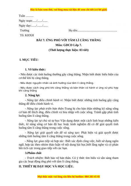 Giáo án GDCD 7 Bài 7 (Cánh diều): Ứng phó với tâm lí căng thẳng