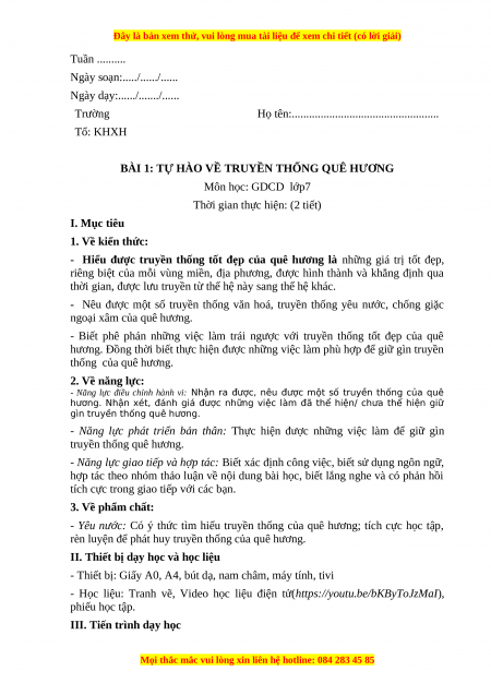 - Năng lực phát triển bản thân: Thực hiện được những việc làm để giữ gìn truyền thống quê hương.