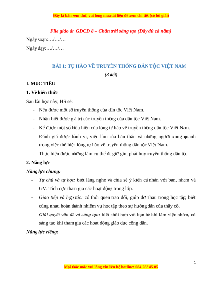 File giáo án GDCD 8 – Chân trời sáng tạo (Đầy đủ cả năm) Ngày soạn:…/…/… Ngày dạy:…/…/…