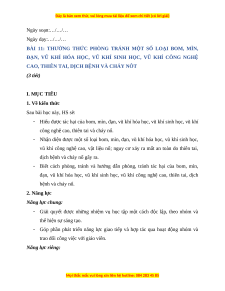Giáo án GDQP 10 Bài 11 (Cánh diều): Thường thức phòng tránh một số loại bom, mìn, đạn, vũ khí hóc học, vũ khí sinh học, vũ khí công nghệ cao, thiên tai, dịch bệnh và cháy nổ