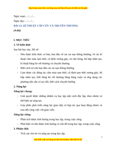 BÀI 12: KĨ THUẬT CẤP CỨU VÀ TRUYỀN THƯƠNG (4 tiết) I. MỤC TIÊU 1. Về kiến thức Sau bài học này, HS sẽ: