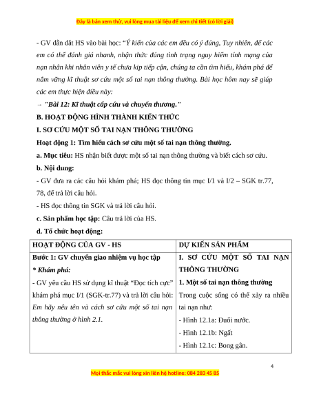 a. Mục tiêu: HS nhận biết được một số tai nạn thông thường và biết cách sơ cứu. b. Nội dung: