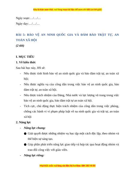 BÀI 5: BẢO VỆ AN NINH QUỐC GIA VÀ ĐẢM BẢO TRẬT TỰ, AN TOÀN XÃ HỘI (2 tiết) I. MỤC TIÊU 1. Về kiến thức Sau bài học này, HS sẽ: