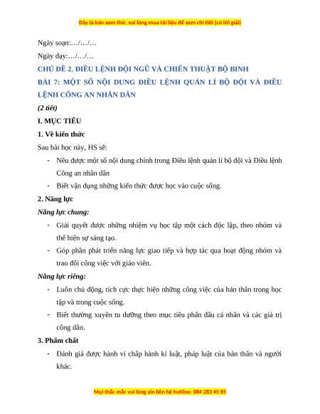 Giáo án GDQP 10 Bài 7 (Cánh diều): Một số nội dung điều lệnh quản lí bộ đội và điều lệnh công an nhân dân