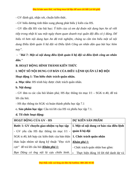 BÀI 7: MỘT SỐ NỘI DUNG ĐIỀU LỆNH QUẢN LÍ BỘ ĐỘI VÀ ĐIỀU