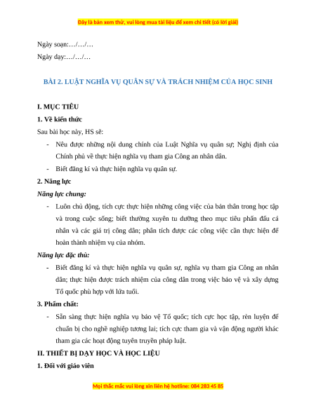 BÀI 2. LUẬT NGHĨA VỤ QUÂN SỰ VÀ TRÁCH NHIỆM CỦA HỌC SINH I. MỤC TIÊU 1. Về kiến thức Sau bài học này, HS sẽ: