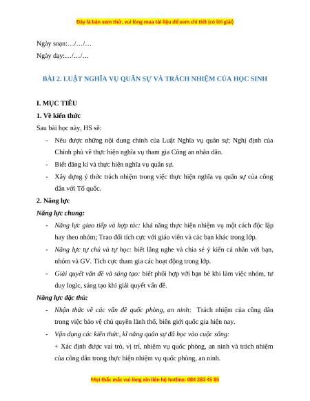 BÀI 2. LUẬT NGHĨA VỤ QUÂN SỰ VÀ TRÁCH NHIỆM CỦA HỌC SINH I. MỤC TIÊU 1. Về kiến thức Sau bài học này, HS sẽ:
