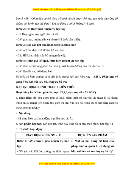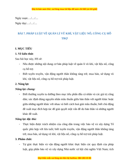 Giáo án GDQP 11 Bài 7 (Cánh diều): Pháp luật về quản lí vũ khí, vật liệu nổ, công cụ hỗ trợ