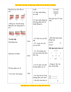 Phương pháp, tổ chức và yêu cầu Hoạt động GV Hoạt động HS I. Phần mở đầu 5 – 7’ Nhận lớp Gv nhận lớp, thăm Đội hình nhận lớp hỏi sức khỏe học sinh phổ biến nội dung, yêu cầu giờ học - Cán sự tập trung lớp, điểm số, báo cáo sĩ số, tình hình lớp cho GV. Khởi động 2 x 8 N - GV HD học sinh - Xoay các khớp cổ tay, khởi động.