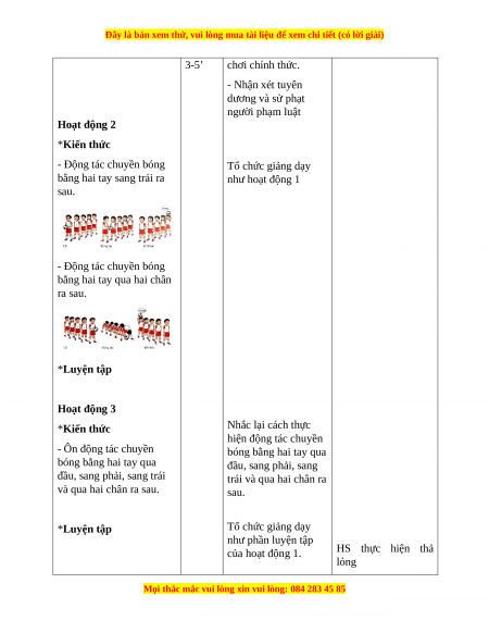 3-5’ chơi chính thức. - Nhận xét tuyên dương và sử phạt người phạm luật Hoạt động 2 *Kiến thức - Động tác chuyền bóng Tổ chức giảng dạy bằng hai tay sang trái ra như hoạt động 1 sau. - Động tác chuyền bóng bằng hai tay qua hai chân ra sau. *Luyện tập Hoạt động 3 *Kiến thức Nhắc lại cách thực hiện động tác chuyền - Ôn động tác chuyền bóng bằng hai tay qua bóng bằng hai tay qua đầu, sang phải, sang