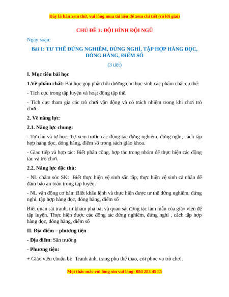 Giáo án GDTC 1 Cánh diều Tư thế đứng nghiêm, đứng nghỉ, tập hợp hàng dọc, dóng hàng, điểm số