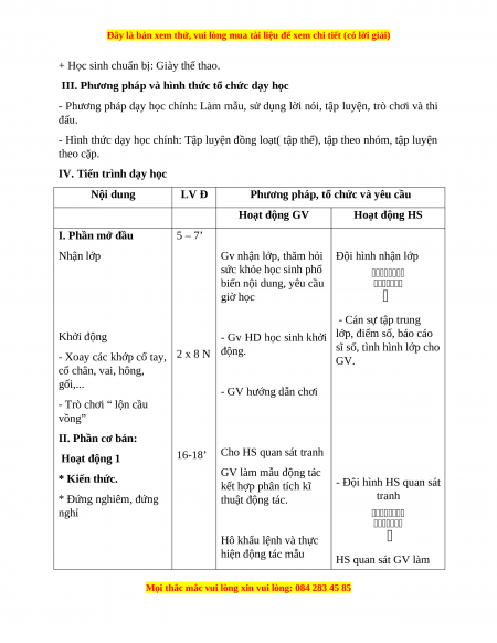 - Phương pháp dạy học chính: Làm mẫu, sử dụng lời nói, tập luyện, trò chơi và thi đấu.