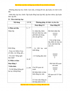 Phương pháp, tổ chức và yêu cầu Hoạt động GV Hoạt động HS I. Phần mở đầu 5 – 7’ Nhận lớp Gv nhận lớp, thăm Đội hình nhận lớp hỏi sức khỏe học sinh phổ biến nội dung, yêu cầu giờ học - Cán sự tập trung lớp, điểm số, báo cáo sĩ số, tình hình lớp cho GV. Khởi động 2 x 8 N - Gv HD học sinh - Xoay các khớp cổ tay, khởi động.