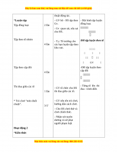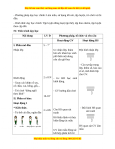 Phương pháp, tổ chức và yêu cầu Hoạt động GV Hoạt động HS I. Phần mở đầu 5 – 7’ Nhận lớp Gv nhận lớp, thăm Đội hình nhận lớp hỏi sức khỏe học sinh phổ biến nội dung, yêu cầu giờ học - Cán sự tập trung lớp, điểm số, báo cáo sĩ số, tình hình lớp cho GV. Khởi động 2 x 8 N - Gv HD học sinh - Xoay các khớp cổ tay, khởi động.