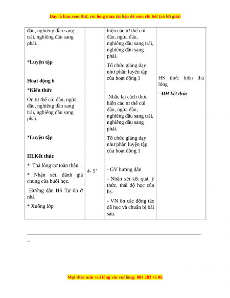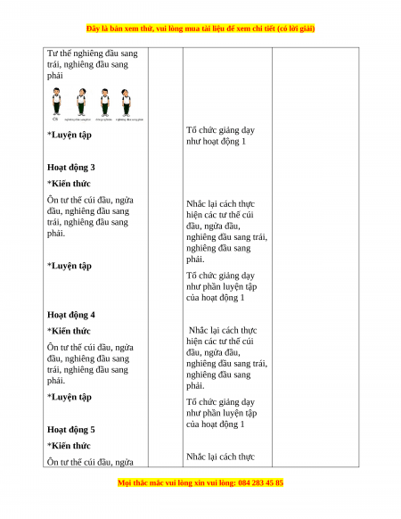Ôn tư thế cúi đầu, ngửa Nhắc lại cách thực đầu, nghiêng đầu sang hiện các tư thế cúi trái, nghiêng đầu sang đầu, ngửa đầu, phải. nghiêng đầu sang trái, nghiêng đầu sang phải. *Luyện tập Tổ chức giảng dạy như phần luyện tập của hoạt động 1 Hoạt động 4 *Kiến thức Nhắc lại cách thực hiện các tư thế cúi